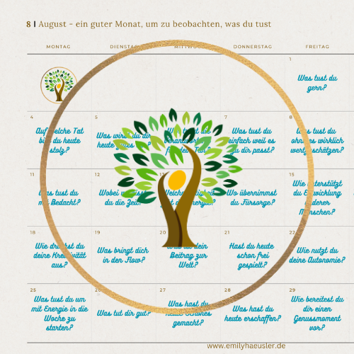 Schön, dass du hier bist! Im August dreht sich alles ums Tun. Inspiriert von Logotherapie und Positiver Psychologie lade ich dich ein, darüber nachzudenken, was dir aktuell wirklich guttut, womit du diesen Monat Gutes in die Welt bringen möchtest, welchen kleinen, aber wichtigen Beitrag du in deinem Umfeld leisten willst und was du ganz bewusst in dein Leben einladen möchtest. Viele weitere dieser Fragen findest du im Kalenderblatt für August und den Link dazu weiter unten.