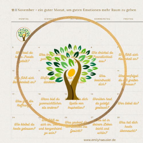 Schön, dass du hier bist! Im November dreht sich alles um positive Emotionen und was sie in uns auslösen. Freu dich auf das neue Kalenderblatt mit inspirierenden Reflexionsfragen, die dich einladen, deine ganz persönlichen guten Gefühle zu entdecken. Ich stelle dir eine einfache, aber wirkungsvolle Übung vor: den “Positiven Tagesrückblick”.